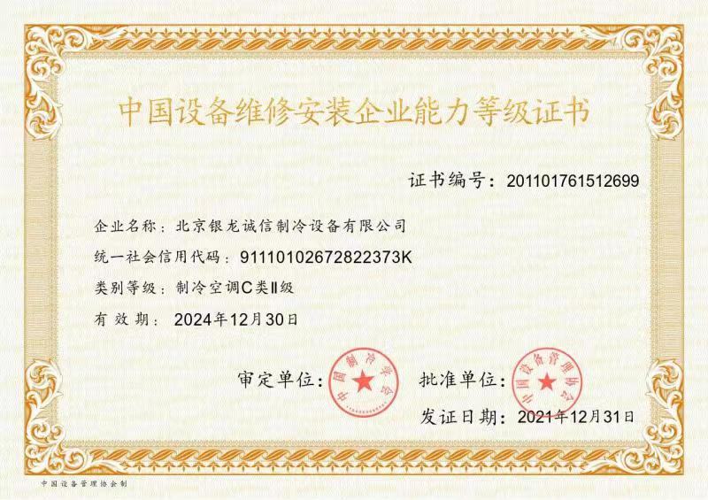 2007年:獲準成為北京市制冷行業技術學會理事單位; 2009年:獲得北京市大興區百強企業認證; 2009年:獲得國家高新技術企業認證; 2011年:獲北京市安全生產先進企業稱號,節能環保先進單位; 2012年:通過了國家高新技術企業復審; 2013年:公司董事長獲"2013北京先進企業家"榮譽稱號; 2014年:獲2014年度中國冷庫工程安裝設計造價行業十大品牌;